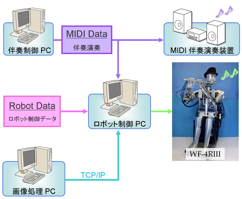 | 人間形フルート演奏ロボットWF-4RIIIは,伴奏用MIDIデータの出力を行うMIDIコントロールパソコンとロボット制御用パソコンおよび画像処理用パソコンにより演奏を行っております.MIDIコントロールパソコンはMIDI音源への伴奏データを出力し,MIDI信号に同期してロボット制御パソコンがロボットの制御を行います.ロボット制御パソコンはロボットデータと呼んでいるデータを利用して演奏を行います.ロボットデータには各音名に対するロボットの制御パラメータが記録されています.また画像処理用パソコンではCCDカメラから取り込んだデータの処理を行います. |