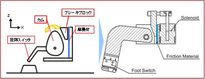 ブレーキ力を摩擦力で発生させるため,高出力のブレーキ等を用いることなく軽量なロック機構を実現することができます.WS-1ではブレーキブロックの駆動装置として双安定型ソレノイドを用い,小型・軽量な機構となっています.