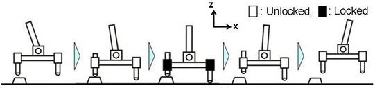 各支持点にはそれぞれ接地を感知するスイッチが設けられており,4つの支持点全ての接地を感知すると各支持点がロックされ,速やかに支持多角形を構成・保持するというものです.そして足が地面から離れると同時にロックを解除します.ロック機構については後の項で説明します.