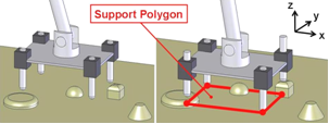 2足歩行ロボットが安定して歩行を行うためには単脚支持期に足底において支持多角形が確保できることが多くの場合前提条件となっています.しかし多くの2足歩行ロボットが採用している剛体平板の足底では,凹凸の多い面を歩行しようとする場合に左下の図の様に満足な支持多角形を構成できず安定した歩行が困難となってしまいます.このような問題を解決するために,凹凸が複数ある路面に接地する場合においても右下の様に満足な支持多角形を構成できるような足部自体が能動的に支持多角形を構成する足部機構の開発を目的としました.