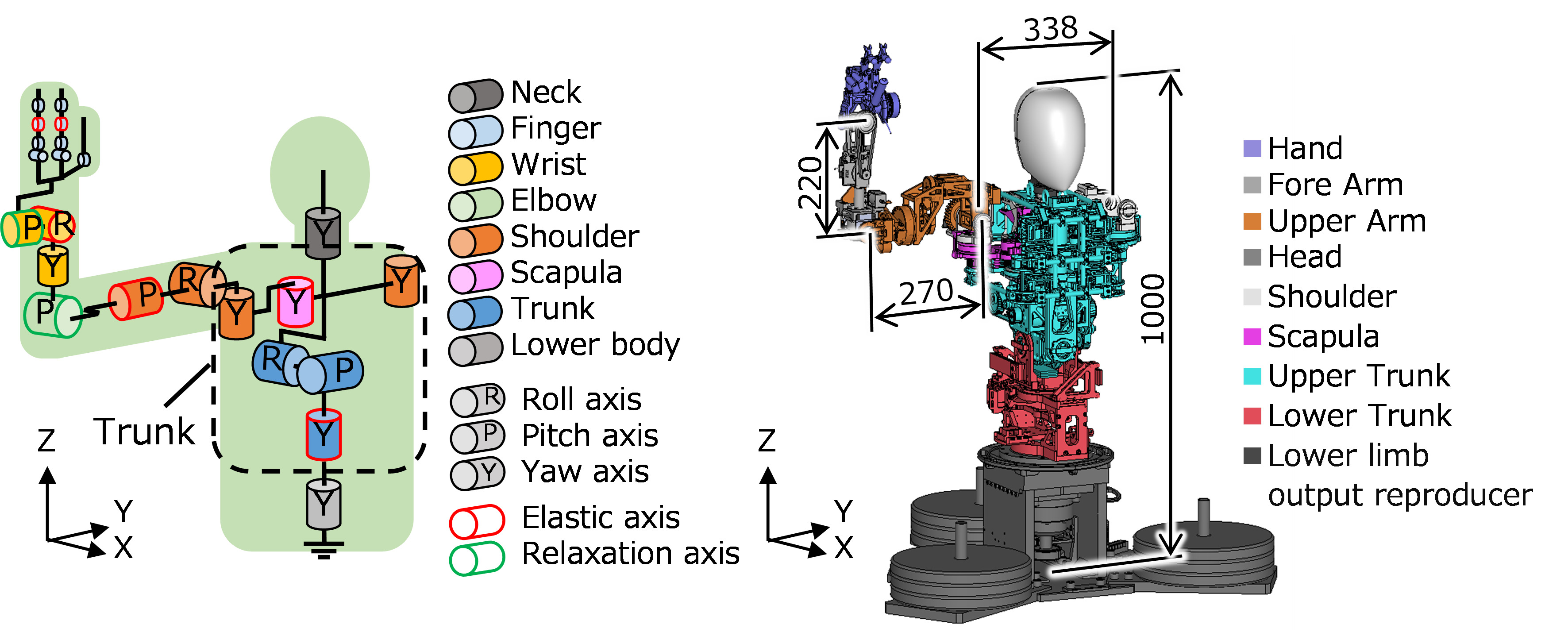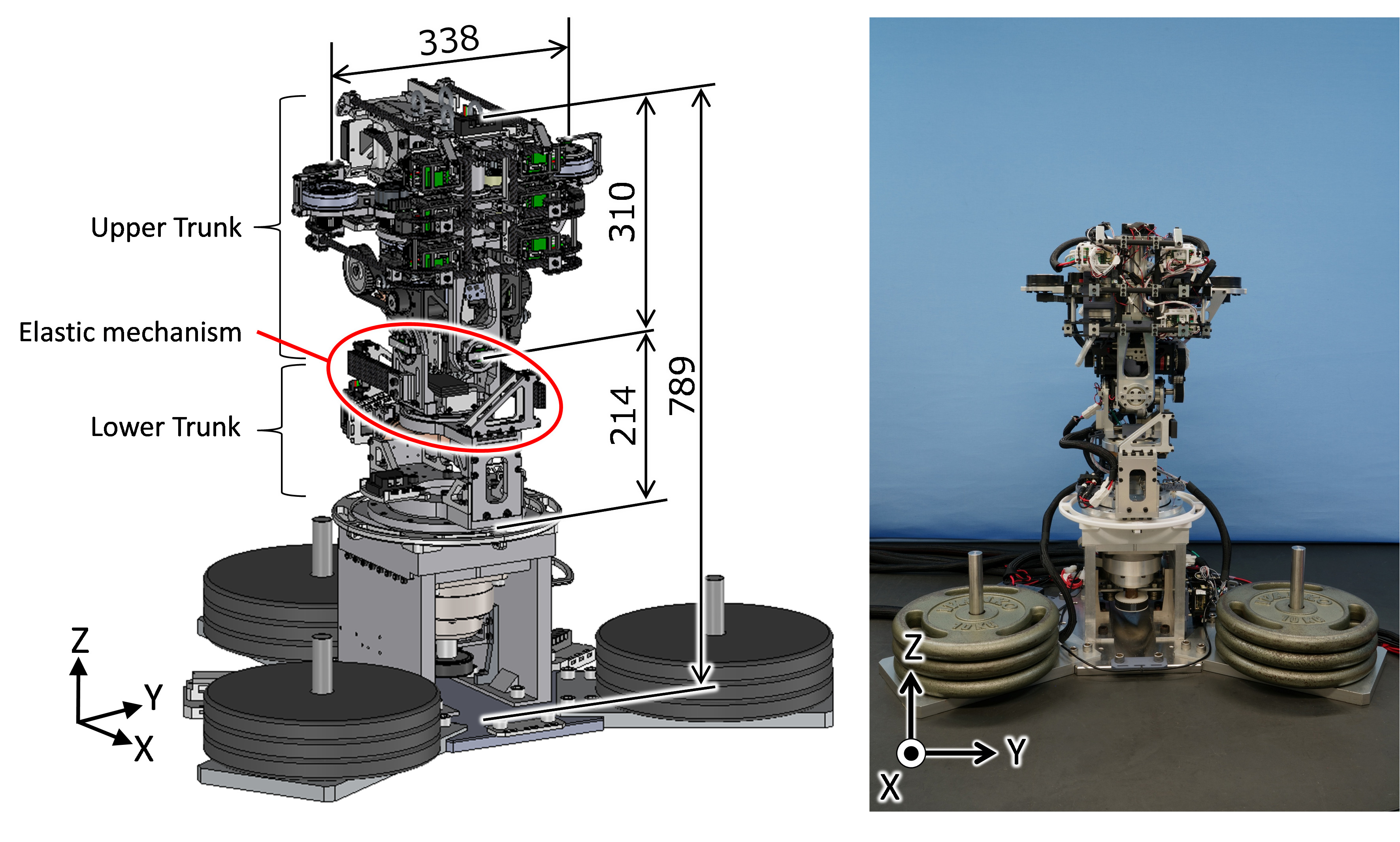 本研究プロジェクトでは,人間の運動技術の工学的な解明を目的として,人間の運動時の特徴を取り入れることにより,アクチュエータの出力に対して,高いパフォーマンスを実現するヒューマノイドロボットの開発を行っています.これまでの研究では,手部・腕部・肩部および体幹部から構成されるロボット開発しました.ロボットには人間の肩関節や肩甲骨における弾性を取り入れることで,人間の投球動作における腕の運動を再現し,約30[km/h]の投球速度において効率的な動作を実現しました.しかしながら、100[km/h]を超えるような投球動作の再現には至っていません.その要因として,これまでの体幹部が肩位置移動の再現を目的として設計されていることが挙げられます.この体幹機構は質量が要求を大幅に超過しており,投球時の人間の出力を発揮できないという問題がありました.そこで本研究では,弾性機構により高効率な投球が可能で人間と同等の質量とリンク長を有するヒューマノイドロボットの体幹機構の開発を目指しました.