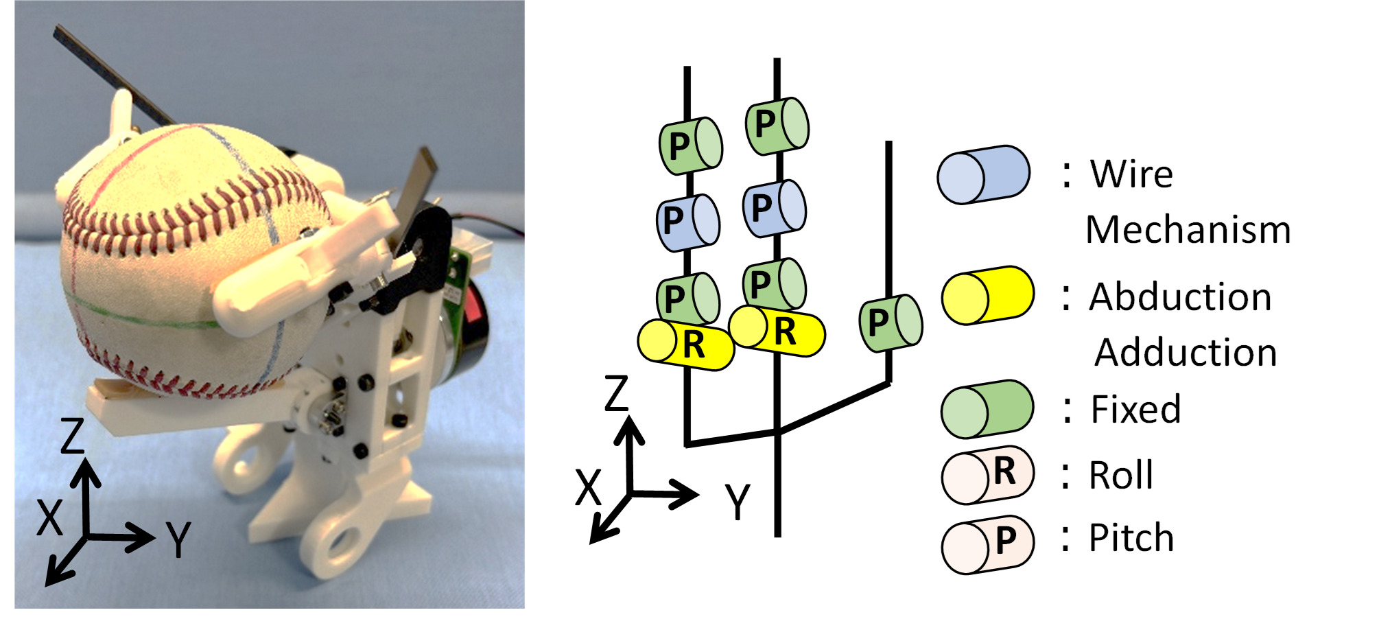 高速投球の実現の妨げとなっていました.そこで本研究では,軽量で高速投球が可能な手部動作機構の開発を目指しました.