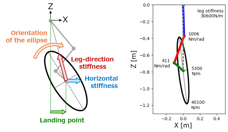 これまでの研究で,人間の跳躍・走行運動を模擬するため,人間の力学的特性を再現した走行ロボットの開発を行ってきました.人間の走行運動では,脚全体が直動ばね,各関節が回転ばねのように振る舞い,それらの剛性は走行速度に応じて変化することが分かっています.これまでの研究で開発されてきたロボットはこの特徴を模擬し,膝関節および足関節に剛性可変機構を搭載しており,関節剛性を変更することが可能です.しかしながら,脚全体の剛性と各関節の剛性の関係性については未確立でした.